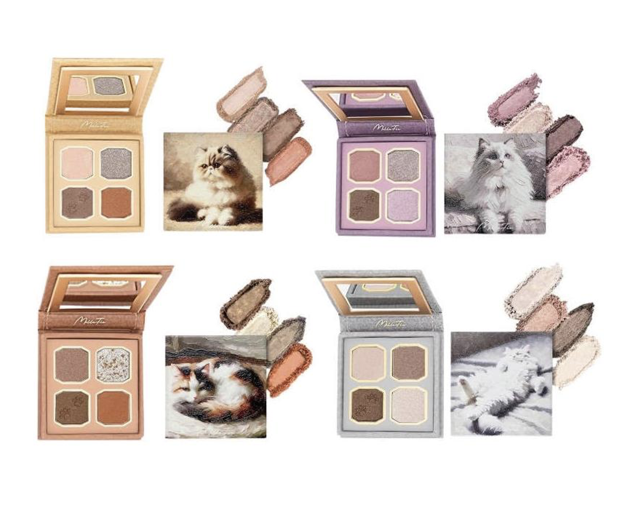 MilleFée 的貓咪系列包裝超吸睛!品牌將經典名畫與可愛貓咪形象結合,從包裝盒到壓紋設計都精緻得像藝術品。包裝精美,品質也毫不含糊,用日系開架價格就能買到專櫃的顯色度。尤其是針對不同品種貓咪(如布偶貓、三毛貓)所調配的專屬配色,每一格都是實用的日常大地色或溫潤粉調。這類走精緻小眾路線的日系彩妝,在台灣藥妝店幾乎見不到身影,是不少網美指定到日本 Loft 必須親自試色、整盒收藏的「夢幻彩妝」。