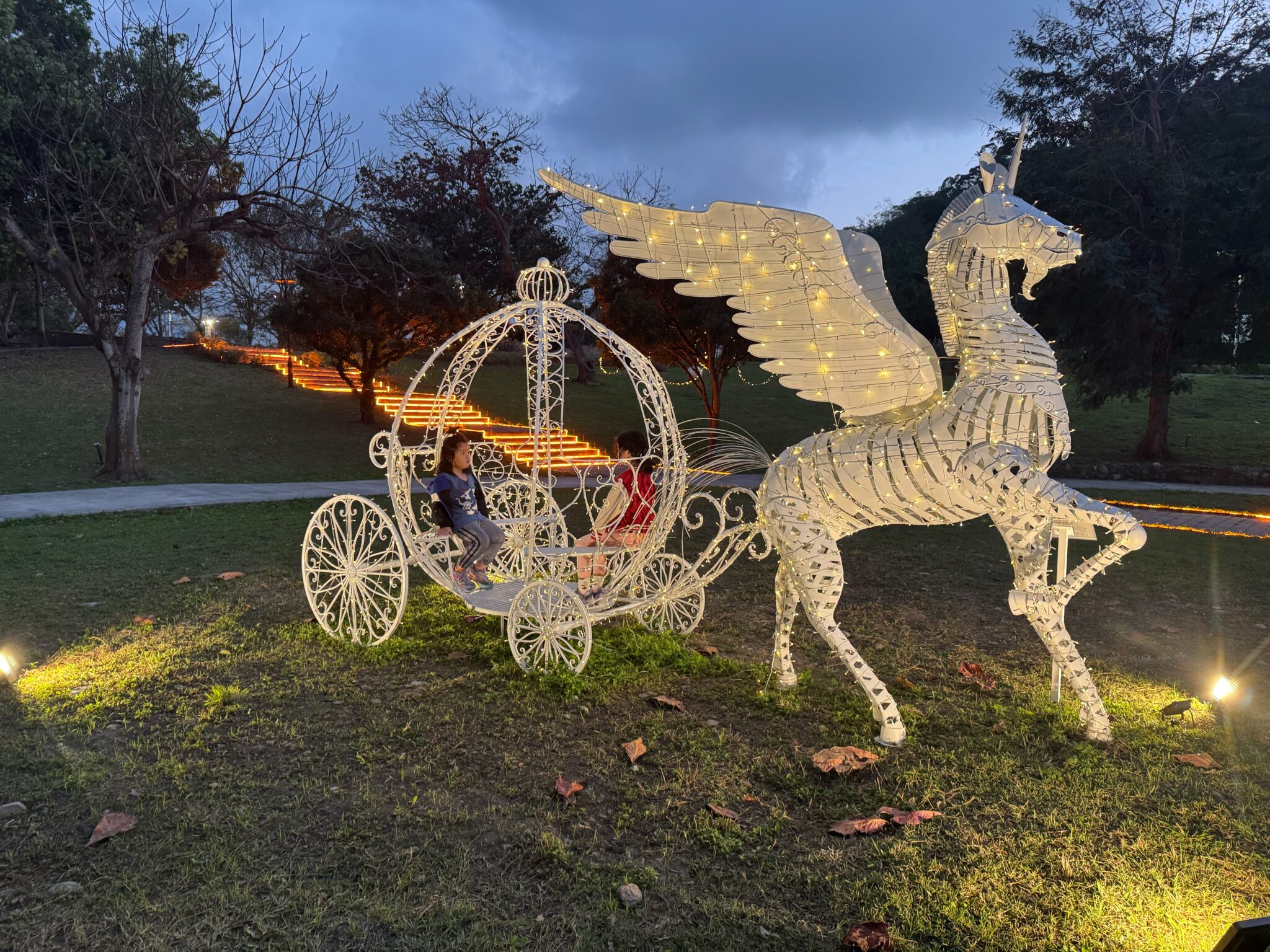 飛馬馬車主燈點亮大陳公園夜色,孩子坐上馬車合影,成為親子賞燈必拍打卡點。(圖片來源:花蓮縣環境保護局)