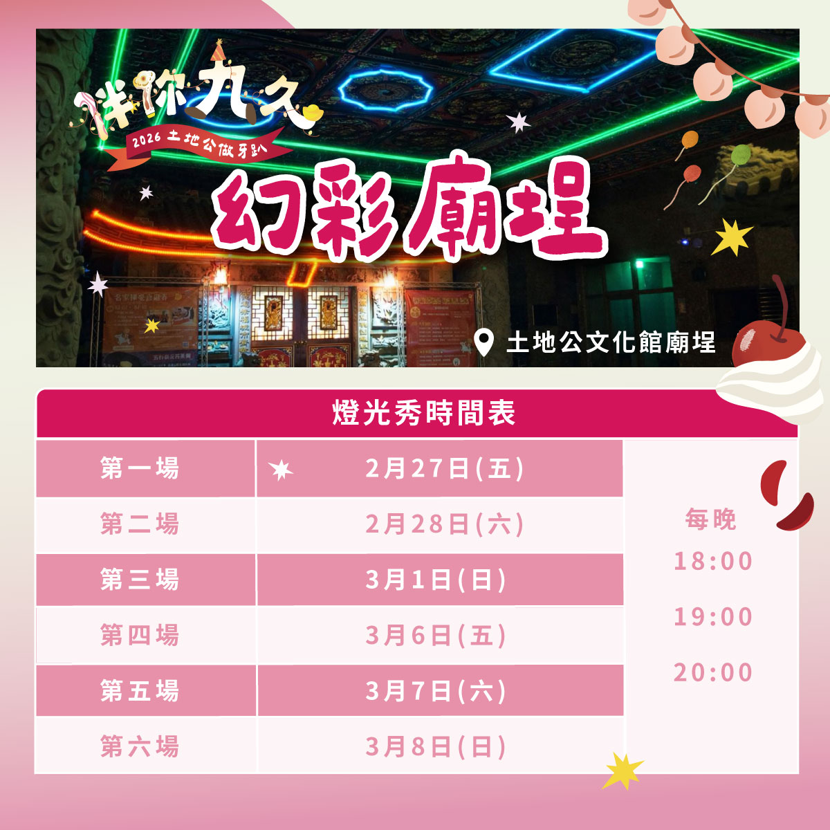 桃園市土地公文化館為慶祝九周年館慶,於農曆二月初二土地公聖誕前夕,規劃自2月27日起連續三個周末於館內舉辦一系列精彩活動,邀請民眾一同為土地公暖壽,感受熱鬧喜慶的民俗氛圍。其中,2月27日至3月1日、3月6日至8日兩個周末,館舍將延長開館時間至晚間8點,廟埕同步舉辦夜間展演活動,內容包括幻彩廟埕燈光秀、火舞、扯鈴特技舞龍、花式拋瓶、光圈舞者及花式陀螺等精彩演出。每日晚間亦有多家特色攤商進駐,集結餐飲美食、行動餐車及文創小物,讓民眾吃得開心、逛得盡興。