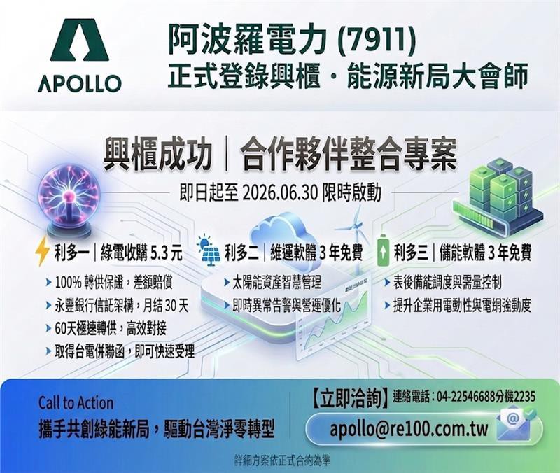 阿波羅電力股份有限公司為慶祝成功登錄興櫃,感謝產業夥伴長期支持,宣布自即日起至 6 月 30 日止推出「興櫃成功合作夥伴優惠方案」,鎖定綠電收購、太陽能維運軟體、表後儲能軟體三大領域,並以最具誠意的條件廣邀全台發電業者加入合作行列,共同打造台灣綠能新生態。