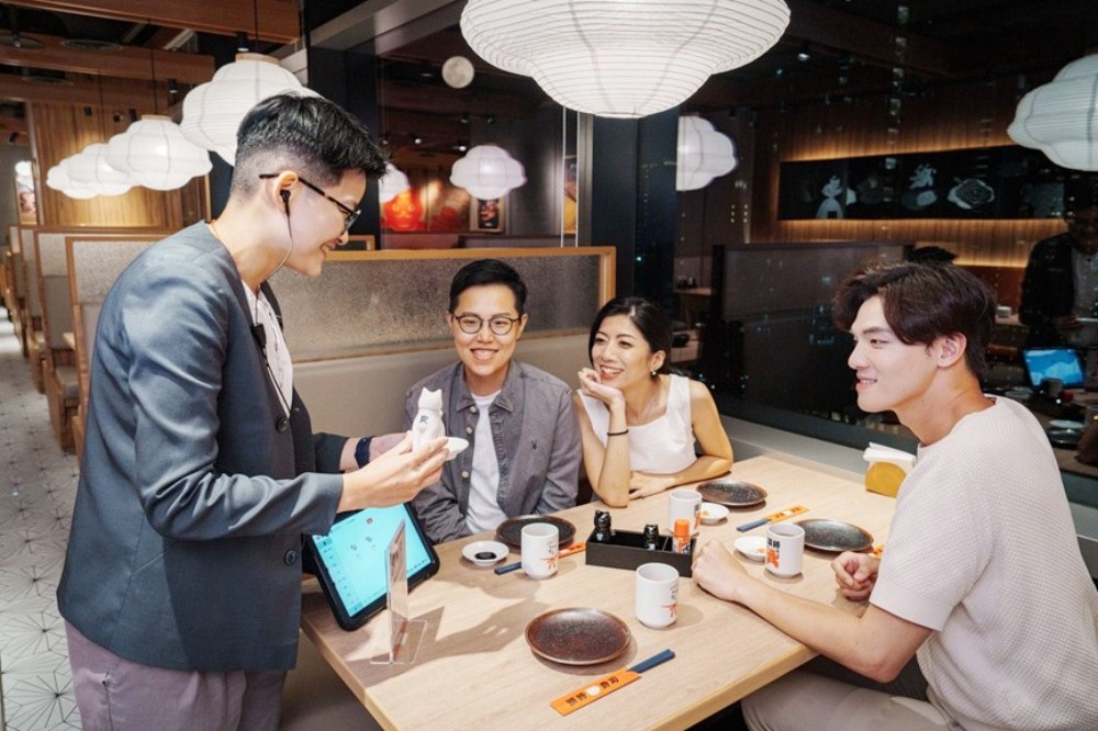 餐廳270度環景視野能白日遠眺都市,夜晚與101夜景同框。木質基調裝潢融入日本文化意象,溫潤中帶有現代時尚。最吸睛的是吉祥物「貓將諭吉」象徵職人堅持,也讓空間多了趣味元素,成為大小朋友的拍照焦點。
