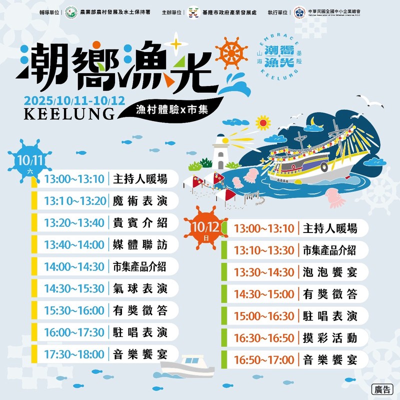 活動規劃四大亮點:「沉浸式展覽與闖關遊戲」,以海洋永續、漁村文化及海廢藝術打造五感體驗;「在地海派市集」,串聯基隆農漁村再生社區與特色商家,展售伴手禮、美食與漁產;「海洋DIY 體驗」,推出「浮球海廢藝術 DIY」、「飛魚卵香腸 DIY」與「海染 DIY」,寓教於樂;「深度導覽小旅行」,帶領遊客走訪八斗子漁港、潮境公園與海岸秘境,探索漁村產業與自然生態之美。現場更安排駐唱音樂、氣球與泡泡表演,並設置互動拍照區與扭蛋機,增添參與樂趣。