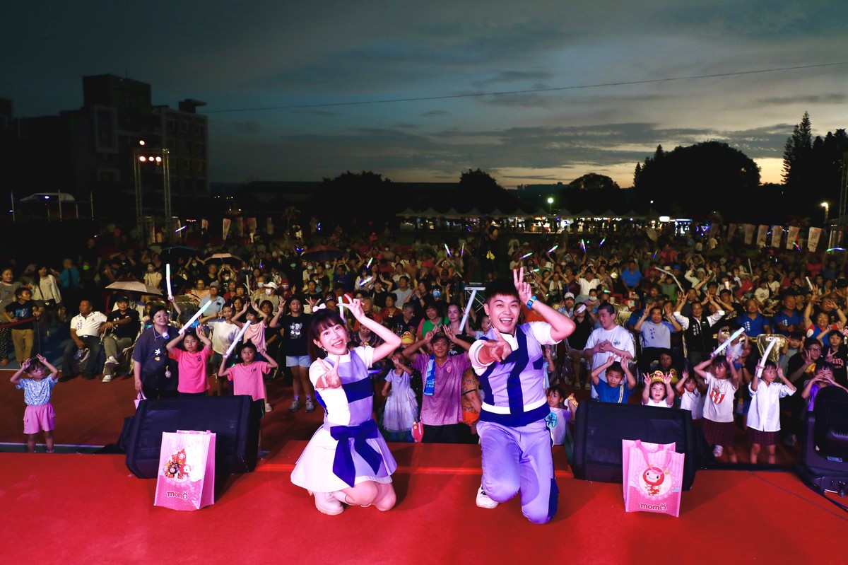 活動一開場,由在地學校與社團帶來活力演出揭幕,隨後多組重量級卡司接力登場,包括金曲獎客語歌后 徐世慧、〈化裝舞會〉歌聲經典的 于台煙、唱回90年代青春記憶的 南方二重唱,以及跨世代金曲代表 方季惟、施孝榮,在歌聲與樂音中掀起現場高潮。小朋友最期待的 MOMO台優格姐姐、大樹哥哥 也帶來活潑互動,吸引大小朋友的掌聲與歡笑。除了表演,晚會現場設有 在地特色市集攤位,美食與手作好物齊聚,吸引民眾邊看節目邊消費,增添濃厚庶民生活的節慶氛圍。