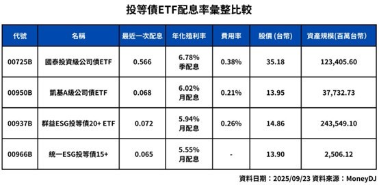 以天期來說,00950B為中天期債券,到期日多介於10-15年期之間,對於利率變化的敏感性較小,也能提供不錯的殖利率。進一步檢視配息頻率、金額和殖利率來看,00950B為月配息型ETF(月底配息),近期配息0.068元,年化殖利率6%,高於其他類似標的,甚至高於BBB等級債券。
