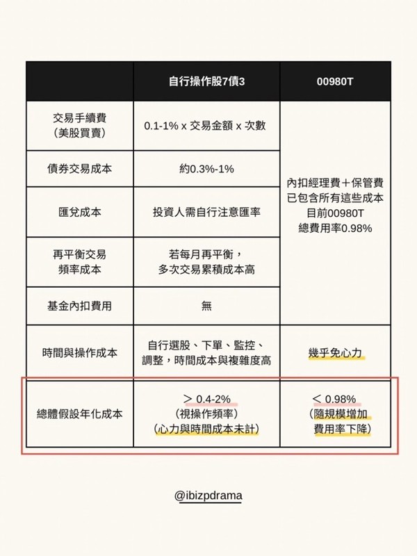 不過其實如果自行操作每月股7債3再平衡,累積成本與耗費心力,應該會超過00980T的內扣費用。