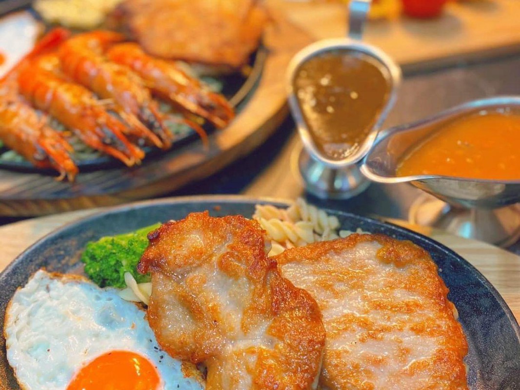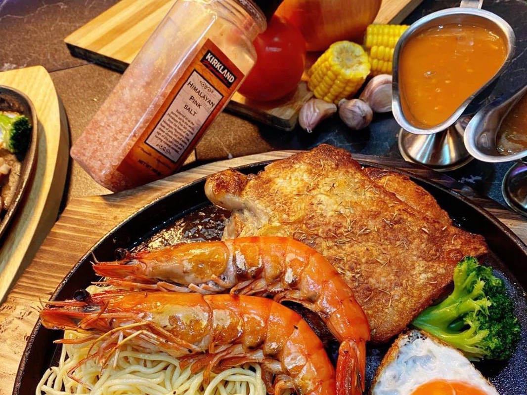 A1:以平價鐵板牛排為主打,餐點涵蓋牛排、雞腿排、豬排、海鮮與多種雙拼組合,搭配豐富自助吧內容,如黃麵、螺旋麵、玉米濃湯、冰淇淋等。