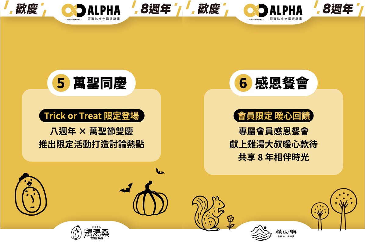 阿爾法餐飲集團今年邁入第八週年,以「8年相伴,陪伴無限」為主題,感謝消費者一路以來的支持與相伴。集團旗下品牌包含 雞湯大叔、麵屋一燈、雞湯桑、賴山嶼 等,於10月起推出「八週年八大玩法」系列活動,透過多重回饋、會員專屬禮遇與公益計畫,邀請顧客一同歡慶品牌成長的里程碑。