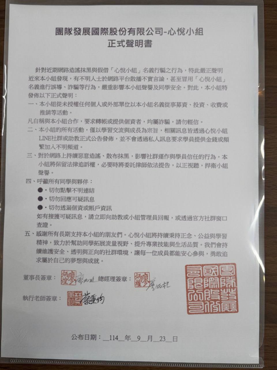 ▲團隊發展國際股份有限公司-心悅小組正式聲明書。(圖/心悅小組官方提供)