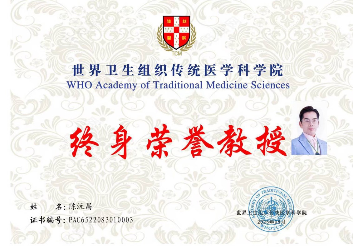 「世界衛生組織傳統醫學科學院」致力於推動傳統醫學與現代醫學的結合,並表彰在全球醫學領域具有影響力的學者與專家。該院設立的「終身榮譽教授」榮銜,每年僅授予少數在醫學研究、臨床應用或社會貢獻上具國際影響力的專業人士,極具權威性與代表性。此次陳沅昌博士脫穎而出,充分展現他在 醫學創新與臨床實踐上的卓越成就。