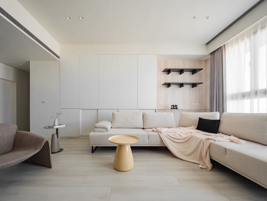 客廳作為公共核心,以L型沙發搭配簡約茶几與單人座椅,營造聚會、休憩與親子互動的多功能場域。設計細節亦不馬虎,從窗簾質感、裝飾畫框線條到家具比例皆精準拿捏,使視覺與實用性達到平衡。
