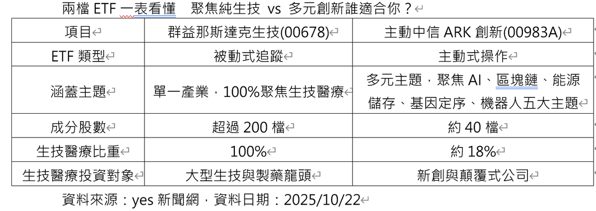 聯準會重啟降息,資金環境轉趨寬鬆,有望帶動生技醫療行情升溫。看好長線潛力的投資人,可透過相關ETF參與布局。其中,群益那斯達克生技(00678)與主動中信ARK創新(00983A)在生技醫療配置上相對突出。前者產業聚焦、生技純度高,但需留意景氣循環風險;後者則鎖定智慧醫療題材,具備前瞻優勢,同時更布局多項創新科技主題,投資面向更為多元。
