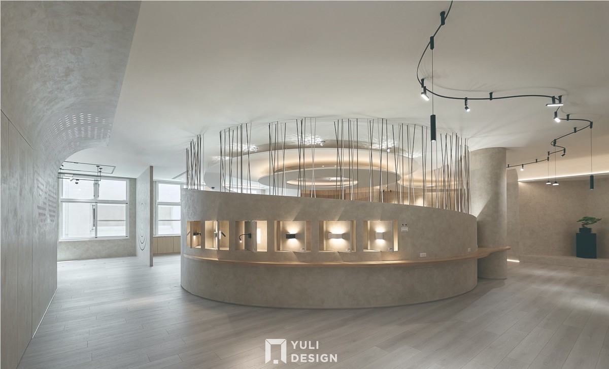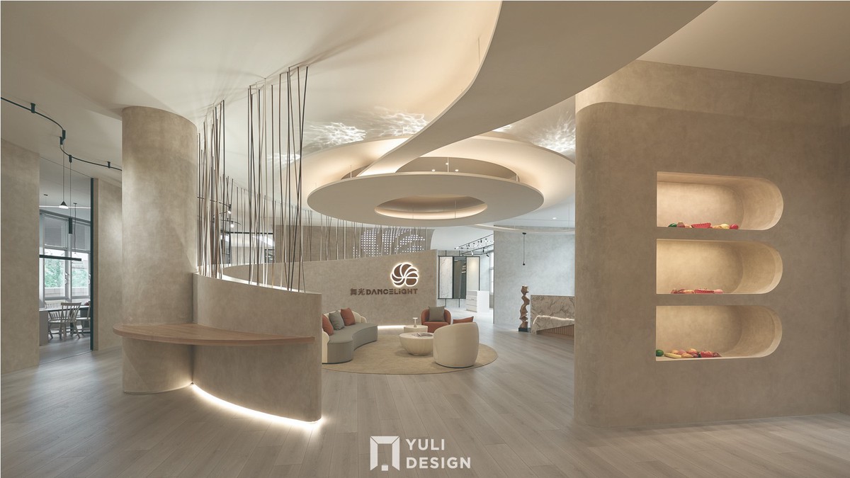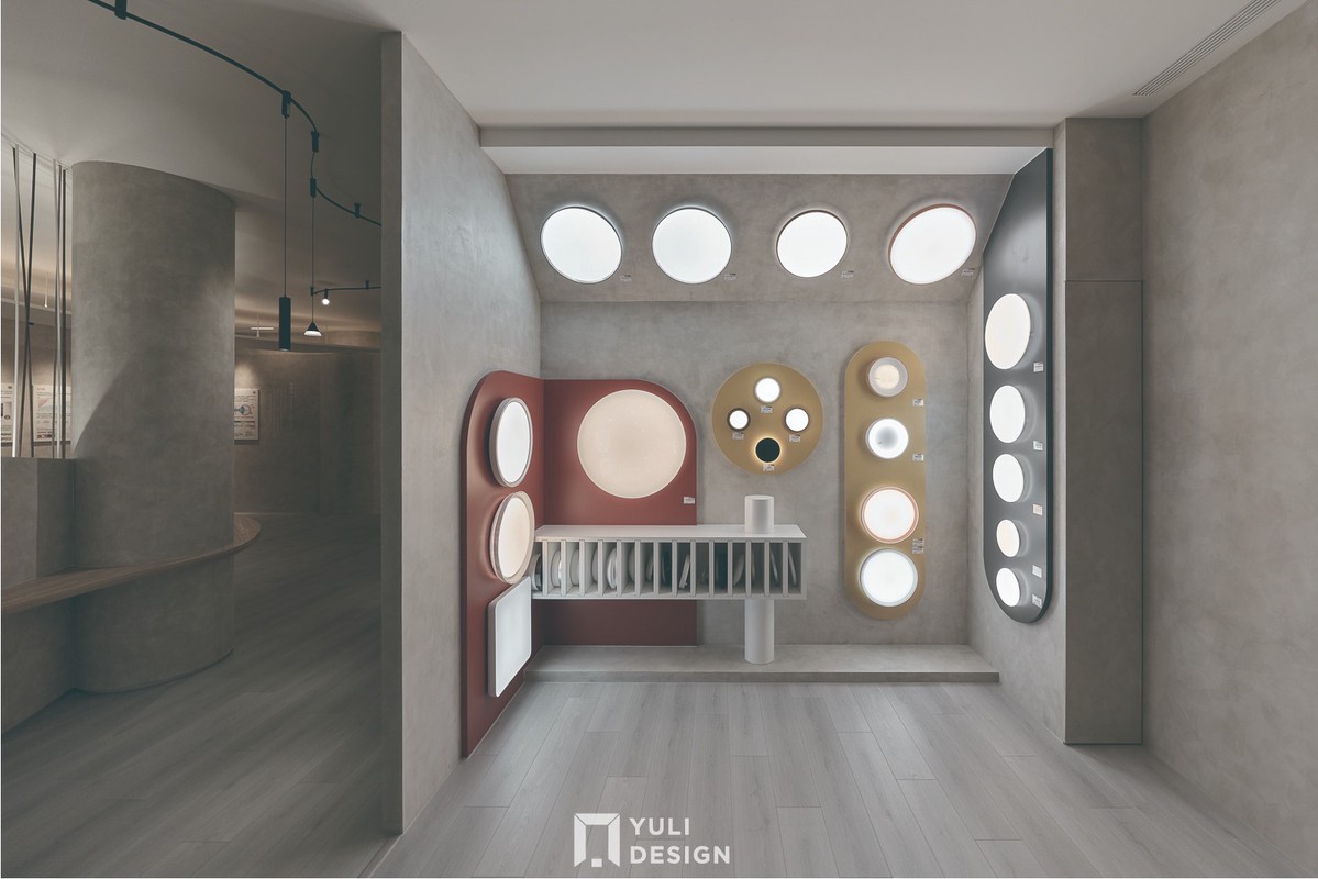 由里國際設計以「空間為人而生」為設計宗旨,量身打造每一個作品。此次在展晟照明體驗館的設計中,以米色系搭配侘寂風格為主軸,營造簡樸、寧靜且富時間感的氛圍。整體空間以光為筆,描繪多層次的視覺節奏,如天花板間的接光、軌道燈的流動性、壁燈的互動感、以及牆面燈光映照出的展晟照明LOGO,都成為空間敘事的一部分。一般消費者能透過體驗,理解不同燈具的光影效果與應用差異;而專業設計師則可在此觀察光在空間中的運用邏輯與變化,進一步啟發創意靈感。