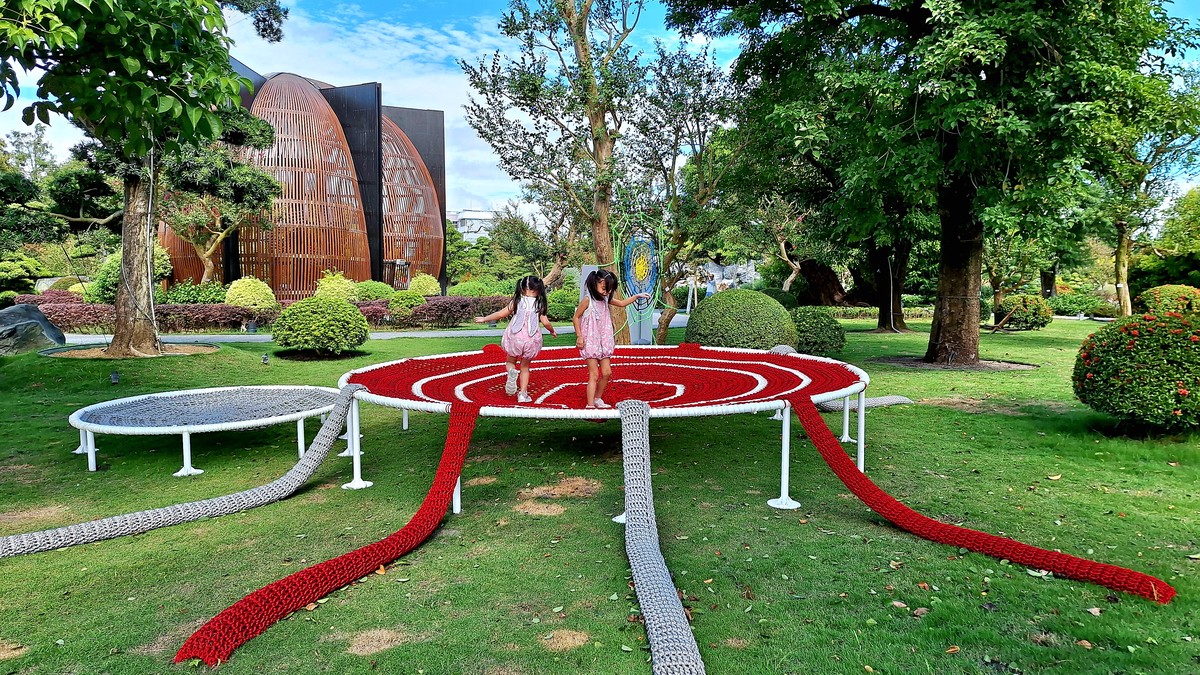 同時,園內打造「巨大蜘蛛捕夢網」,融合彈跳床與休憩空間,透過趣味互動讓孩子重新認識被誤解的「益蟲」蜘蛛,體會其在生態鏈中的重要角色。