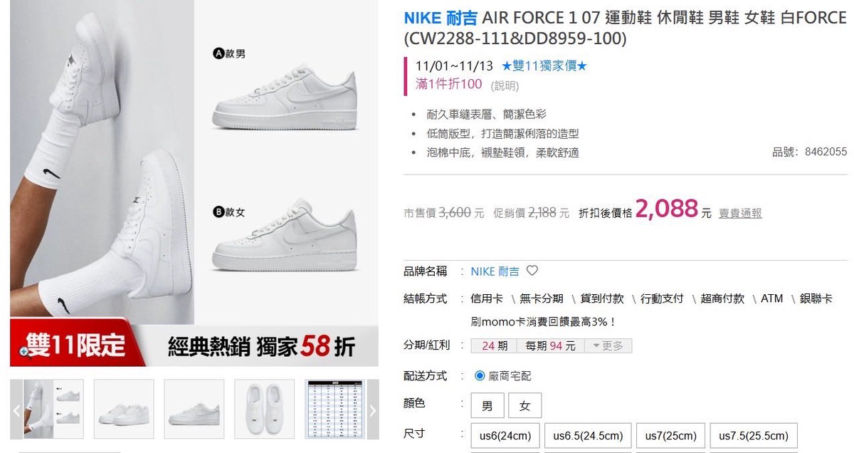原PO在時常跳出夯品訊息與優惠情報的臉書社團「momo網購好物交流」發文透露,momo雙11促銷太划算,吃穿商品適合趁著檔期一次買齊,於是曬出購入的戰利品,首先是經典款「Nike AIR FORCE 1白鞋」,狂誇「從我年輕流行到現在都還在穿,不只百搭又好走,這次特價2088根本無痛入手!」他也透露,此次促銷納入Nike多款好鞋,推薦大家透過APP查詢自己想買的鞋款是否有特價。