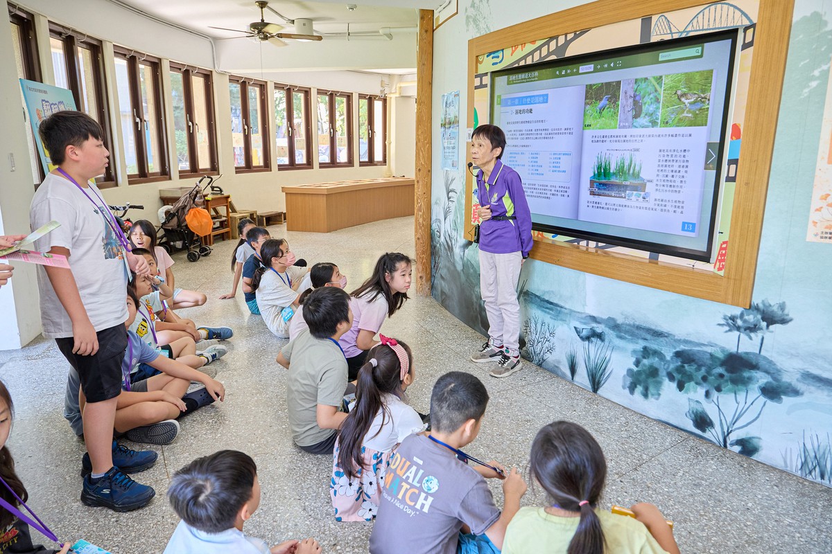 在觸控式螢幕互動中,孩子們認識了館內代言人——高蹺鴴寶寶「三兩六」的故事,其生生不息正是大漢溪濕地的棲地保育成果!透過與志工老師的互動問答,孩子不僅體會保育濕地生態的重要,更樂於幫動植物守護家園。