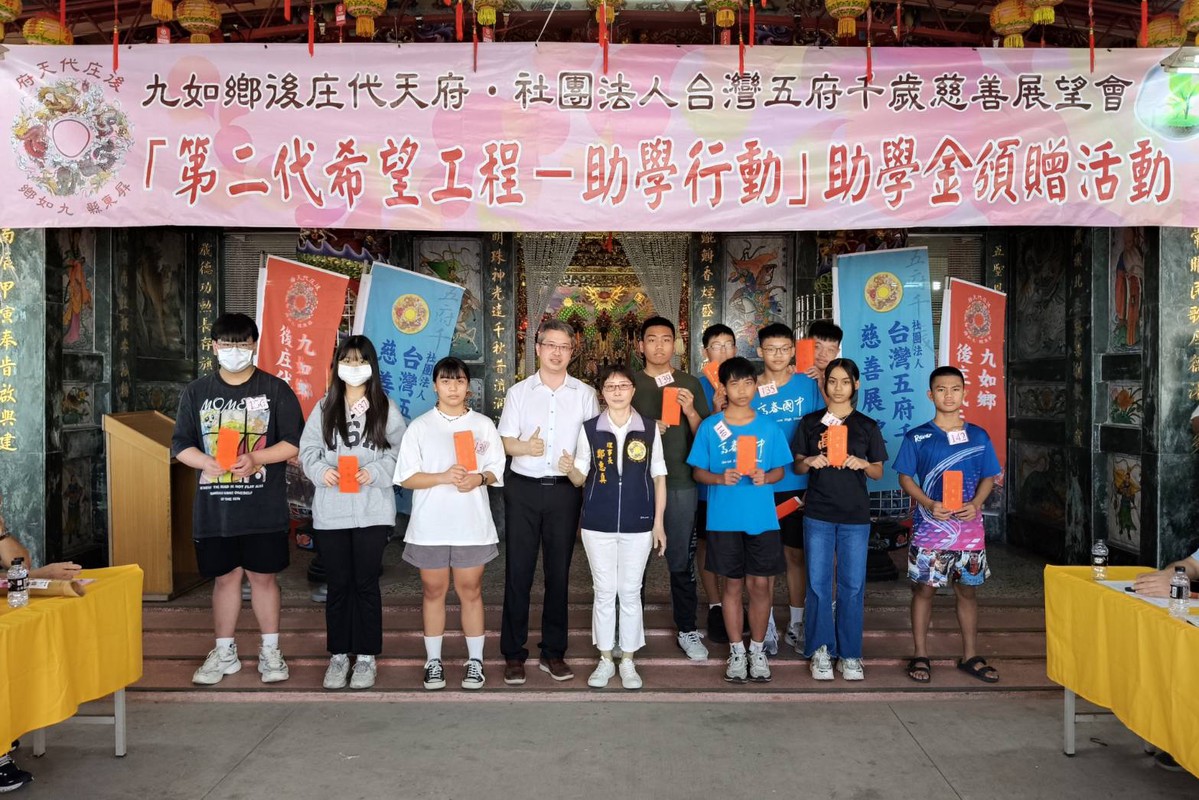 114學年度上學期第二代希望工程助學行動,頒贈活動於今(16)日上午在九如鄉後庄代天府廣場舉行,由台灣五府千歲慈善展望會與後庄代天府共同舉辦,活動包含助學金頒發、感謝狀致贈、愛心竹簡撲滿剖封及腎臟病預防宣導等項目,希望減輕經濟弱勢家庭負擔,讓孩子安心就學。