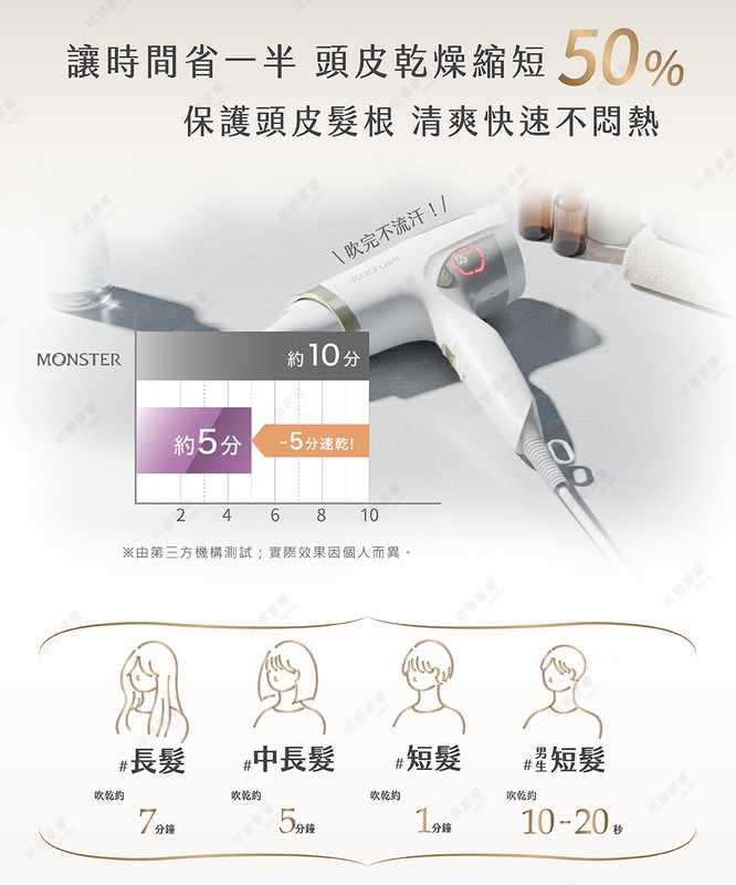 KOIZUMI 在日本是知名的個人美容家電品牌,長年推出各式美髮造型工具。此次引進的小Monster 採用品牌最新的雙 BLDC 馬達設計,透過雙渦輪結構提升風速與風量,協助更迅速地帶走水分。在相同條件下,內部測試顯示可縮短吹乾時間;實際效果則會依個人髮量、環境及使用方式而有所不同。