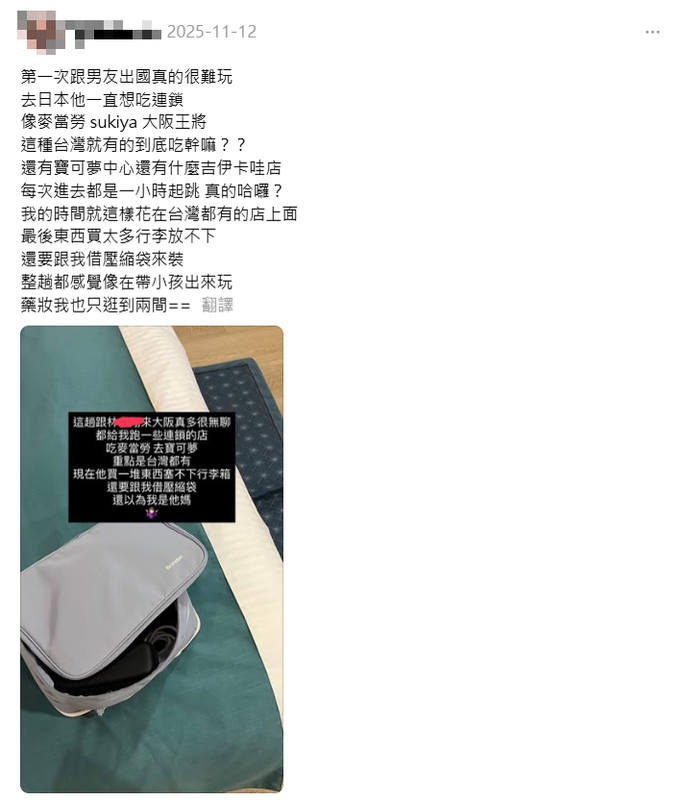 近日一名網友在Threads分享與男友赴日旅遊時的趣事,引發網友熱烈討論。她提到,因男友「超強購物慾」導致行李暴增,還得臨時跟她借壓縮袋打包。