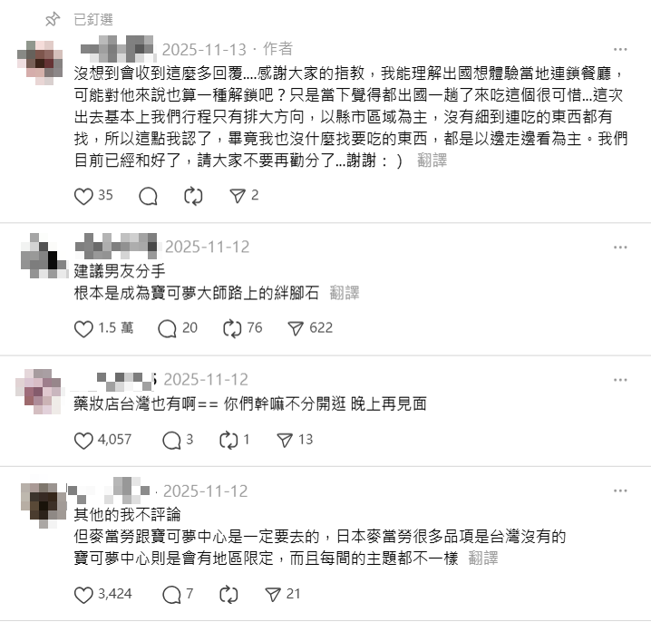 貼文曝光後,不少網友紛紛留言表示太有同感,更有人分享自己旅伴在日本時一樣買到需要再買一顆行李箱,引發一波旅遊共鳴潮。也有網友表示:「建議男友分手 根本是成為寶可夢大師路上的絆腳石」、「藥妝店台灣也有啊== 你們幹嘛不分開逛 晚上再見面」,也有網友討論起日本連鎖餐廳的份量與台灣相比差異甚大,「其他的我不評論 但麥當勞跟寶可夢中心是一定要去的,日本麥當勞很多品項是台灣沒有的 寶可夢中心則是會有地區限定,而且每間的主題都不一樣」。