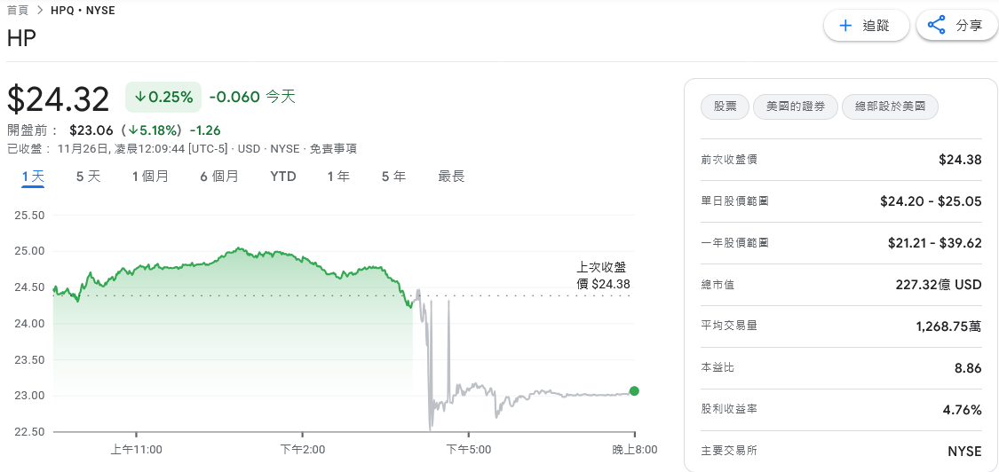 根據HP預測,2026財年每股調整後獲利區間為2.90至3.20美元,低於市場平均預期的3.33美元(LSEG統計),2026第一季每股盈餘預測為0.73至0.81美元,中位數亦低於市場預估的0.79美元;雖然前景承壓,HP第四財季(截至10月31日)營收年增4%至146.4億美元,優於華爾街預測的144.8億美元;淨利7.95億美元,每股盈餘0.84美元,亦高於去年同期的7.63億美元,每股盈餘0.80美元。