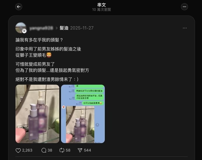 不少女性到了冬天都會覺得頭髮特別的毛躁,尤其在多雨潮濕氣候的台灣更是感受明顯,近期 Threads 上一篇『為了護髮油而鼓起勇氣聯絡前男友』的貼文就引起網友們熱議,除了故事十分逗趣外,不少人也紛紛歪樓討論起自己長年對抗毛躁的經驗,意外讓該篇貼文成為髮油推薦大會。